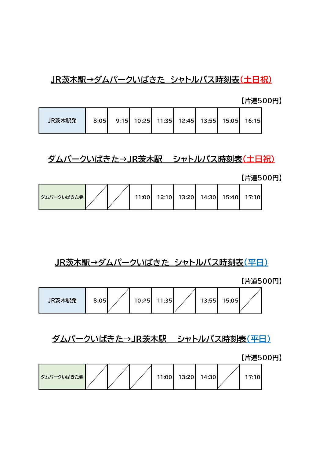 🚌 11月1日(土)よりシャトルバスの運行時間が変更になります。 2025 11/02 未分類 2025.11.02 いつもダムパークいばきたをご利用いただき、ありがとうございます。2025年11月1日より、JR茨木駅~ダムパークいばきた間を運行しているシャトルバスの時刻が一部変更となりました。今回の変更により夕方の便が少なくなっておりますので、お帰りの際は事前に時刻表をご確認ください。 未分類 よかったらシェアしてね! URLをコピーしました! URLをコピーしました! 11月1日(土)より吊り橋エリアの入場時間が変更になります。