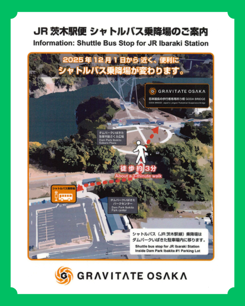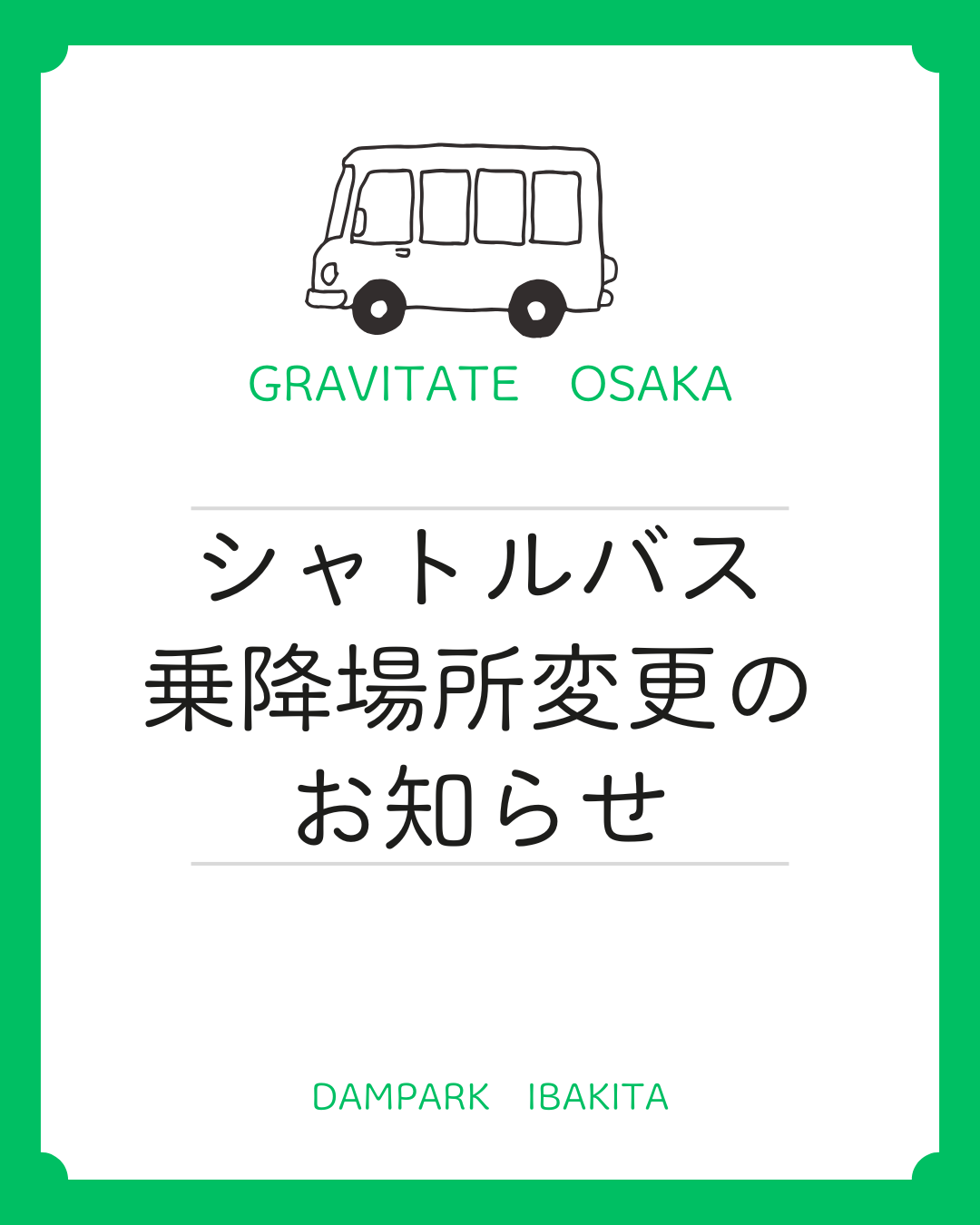 シャトルバス停車場所変更のお知らせ12月1日(月)~ 2025 11/25 公園からのお知らせ 2025.11.25 【12/1(月)~】シャトルバス停留所変更のお知らせ JR茨木駅~ダムパークいばきた間を走行するシャトルバスの停留場所が変更になります。変更後→ダムパークいばきたバス駐車場内 公園からのお知らせ よかったらシェアしてね! URLをコピーしました! URLをコピーしました! 【12月1日(月)~12月12日(金)】パークセンター補修工事のお知らせ