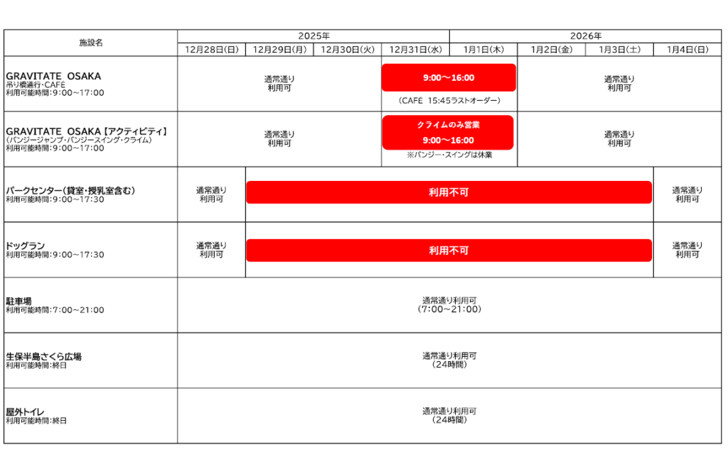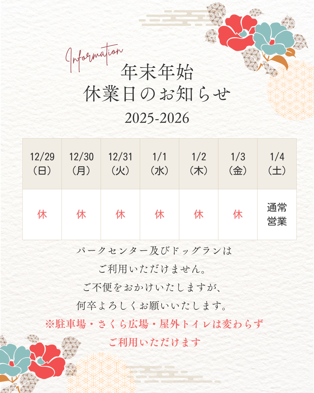 パークセンター及びドッグランは、2025年12月29日から2026年1月3日の期間は、