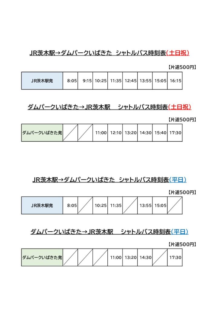 2025年11月5日より、JR茨木駅~ダムパークいばきた間を運行しているシャトルバスの時刻が一部変更となりました。今回の変更により夕方の便が少なくなっておりますので、お帰りの際は事前に時刻表をご確認ください。 -