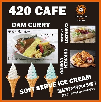 安威川ダムカレー¥1800、軽食¥500~、ソフトクリーム¥500~、生ビール¥800、ソフトドリンク¥400~