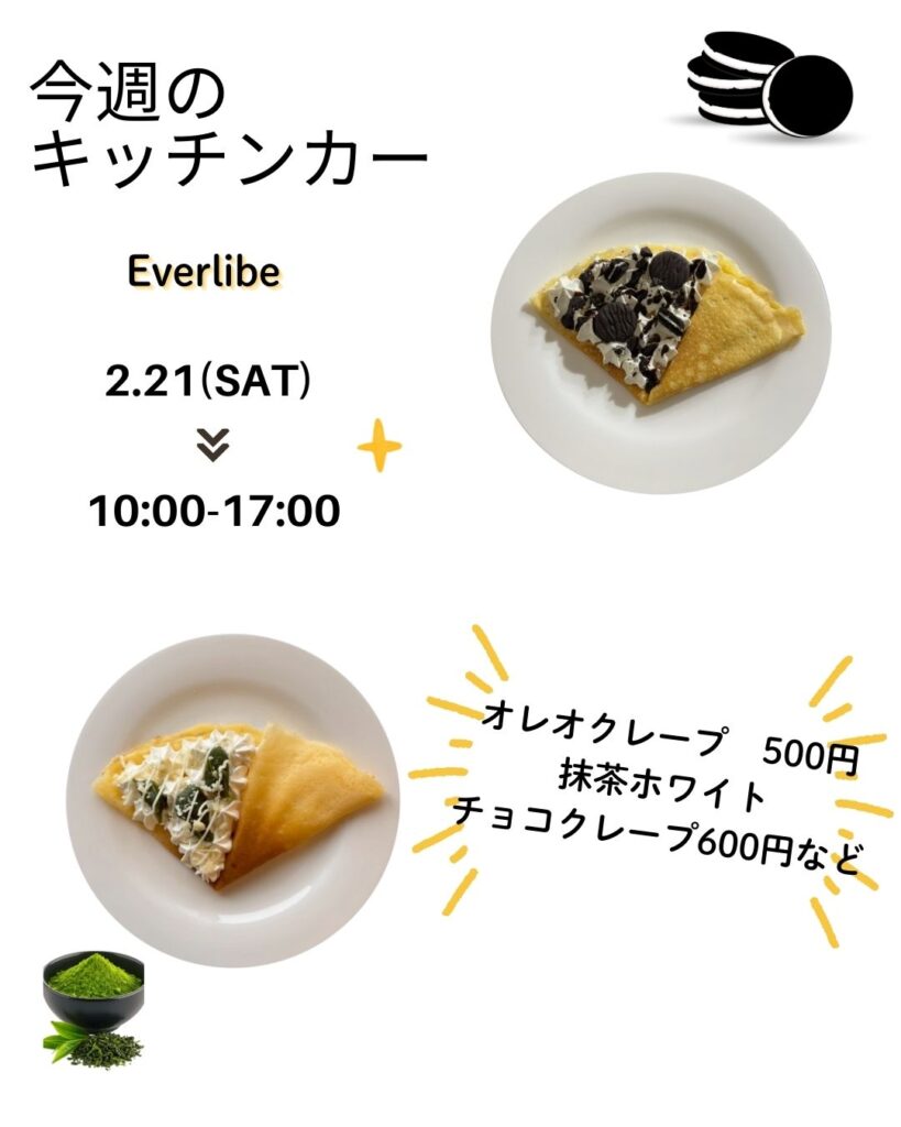 日 程:2026年2月11日(水・祝)時 間:10:00~16:00場 所:パークセンター前雨天時:中止 ダムパークいばきたにキッチンカーが出店します! ・クレープ各種 450 円〜・ドリンク各種 400 円〜・アイスクリーム各種 300 円〜 【問合せ先】 090-9880-4364【...