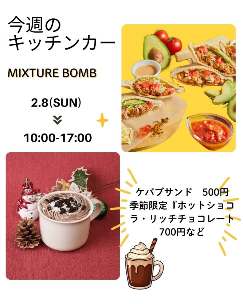 日 程:2026年2月11日(水・祝)時 間:11:00~16:00場 所:パークセンター前 雨天時:中止 キッチンカーで、手作りの懐かしい味のホットドックをお届けします ホットドッグ各種550円~日替わりメニュー各種400円~ 【問合せ先】 m.r.if1030@gmail.com【... -