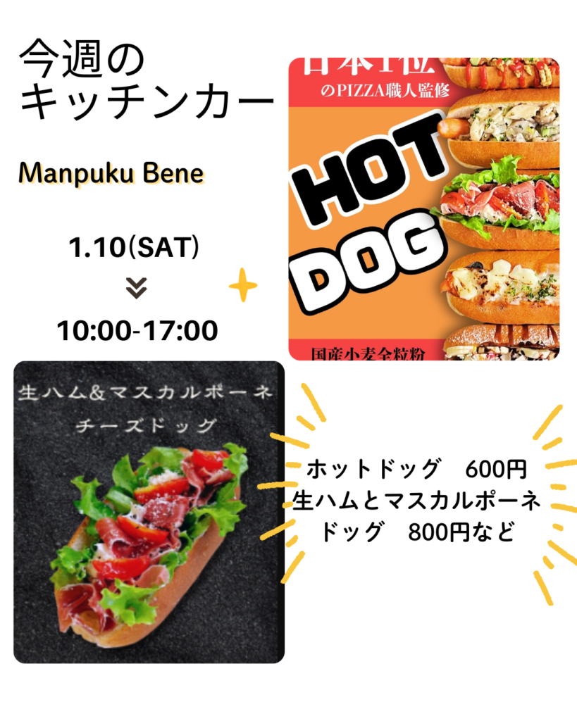 日 程:2026年1月10日(土)時 間:11:00~16:00場 所:パークセンター前 雨天時:決行※中止の際はHPまたはInstagramにてお知らせします。 ダムパークいばきたでホットドッグを販売します!看板商品「イタリア産燻製モッツァレラチーズを使用した自家製... -