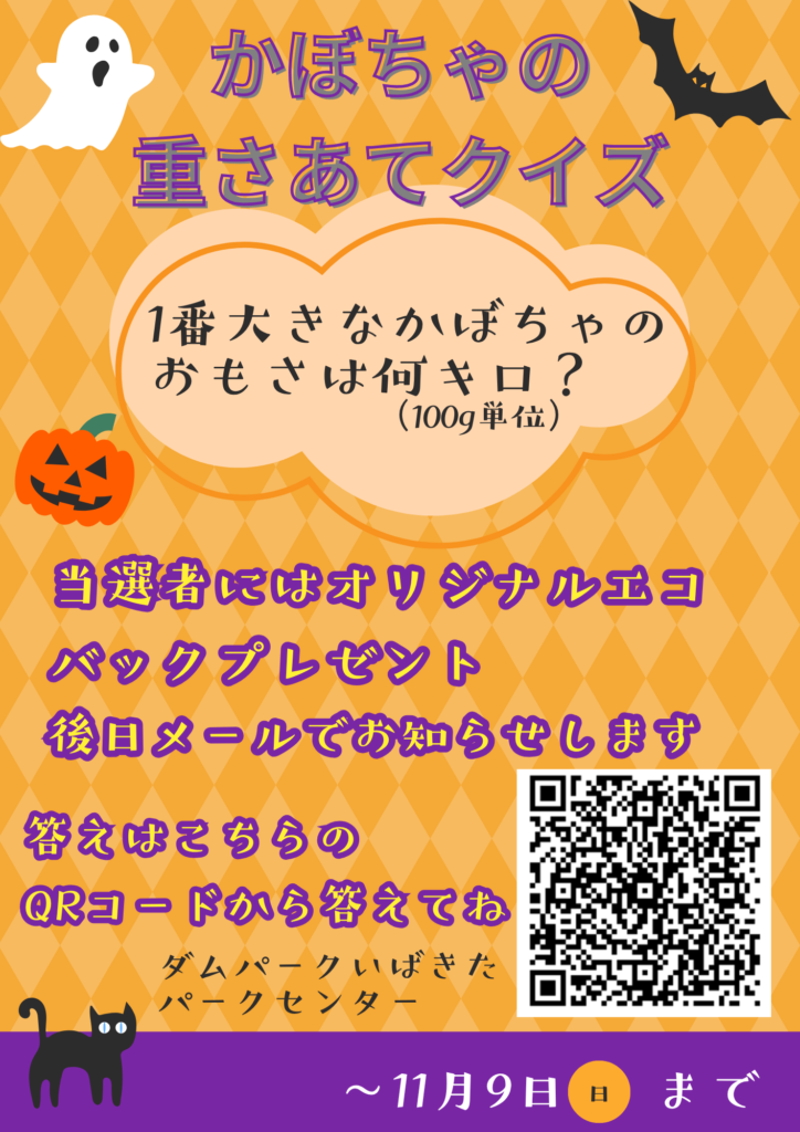 昨年好評だった、【いばきた産 特大かぼちゃ】を今年も開催します。その重さを当てた方には…ダムパークいばきたオリジナルエコバッグプレゼント🎁参加方法はQRコードから簡単応募📱みなさんの挑戦、お待ちしています 当選メールを受け取ら... -